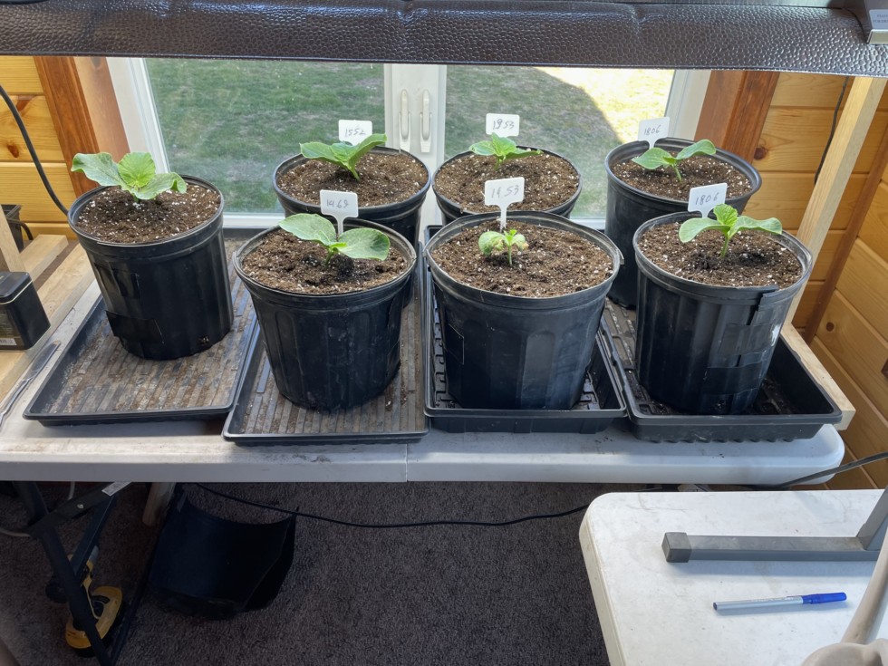 The outside patch plants put into 2 gallon pots today. One of each my 1815,1469 young,1552 young then 2 of each 1593 Daletas, and 1806 Harnica.