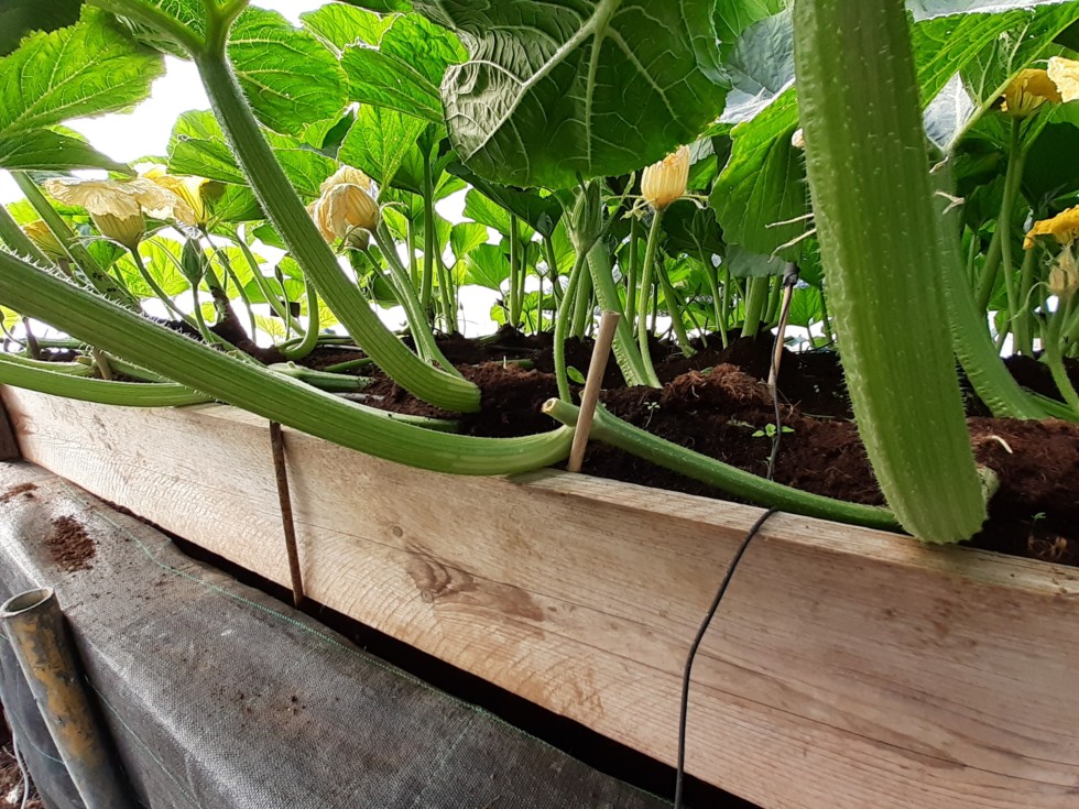 This is my method of keeping the pruned vines within the boundaries after they've been trimmed. One of the advantages of the raised bed is being able to see right through the plant, underneath the leaf canopy. Mind you, it's a bugger for vine burying and fruit taping!!