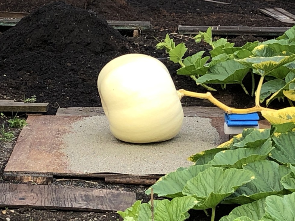 Shape changer alert! If you look at the picture from July 16, we had just put down the board and sand and adjusted the pumpkin so the vine entering and blossom end were equidistant from the ground. We also made sure we blocked up the extra slack in the vine, a great practice taught to me by SoCal Chris. I always admired his diary photos of perfectly placed and supported vines, and we spent considerable time at one of the conferences and online, about this technique.
