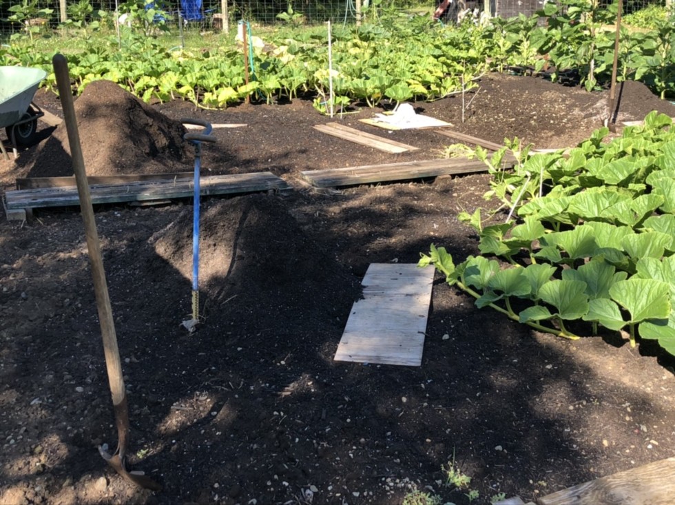 Yes, we weed and prep the soil in front of the secondaries with a broadfork. Then, with stockpiled compost/peat moss and perlite mixed, we perform a vine burying method somewhere between the Paton�s pot method and Richmond Dave�s vine burying method. Then, after that if weeds grow, then they grow under the pumpkin leaf canopy.