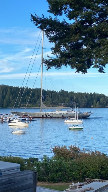 Pulling into the Marina below us is the M5 sailboat owned by oil magnate Rodney Lewis of Texas. A 75 metre sailboat, it fit in the Marina at the end pier, usually reserved for our military, fisheries, RCMP and law enforcement boats, quite a sight.