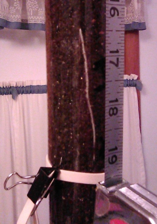 Lil' Baby Doll took a tumble today; I had 'er standing up in a new spot in the living room because the seedling was growing toward the light at night and was getting misguided - Even though I gave it the 'topsy-turvy test' and had fiber board under it, it tipped over at about 10 am. Luckily, I was half awake and lept like a trooper to its rescue, lol; It had fallen with its midpoint of the plastic tube over a duffel bag and someting harder, kinking the tube slightly and allowing about a half cup of SS mix to spill out - butt NO damage to Baby Doll!!! I would say 'Tough Plant, butt more likely it was seriously LUCKY! No damage. None. Cool! Maybe the plant growing outward caused it...Ooooohhh......