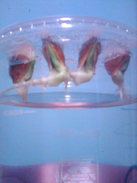 Okay, from left to right, #2 and #4 have full-length roots happpening (#4's is offa the right of your screen), whereas #1 is growing a little club-rooty and #3 is actually growing butted up against the side of #2. Like a nest of birds, each is its own, individual little bugger! So, what I think is gonna happen is the leaves' growth will push the root assembl(ies) outta the seed coats and potentially, the seedlings could actually drop off, but be submerged, into the water; Not sure yet why they are growing SIDEways, butt, in due time, lol. Probably like a new jellyfish - but straight downward. It'd be funny to find that the seedlings float; Some plants populate new lands by doing just that!