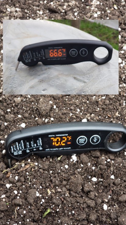 Heating cables and air space heater both working to make a nice comfortable environment for the transplants. 70f in the soil and 66 inside the cloche. This is the 1st time I've used space heaters and without them you can never get the air temperature high enough.