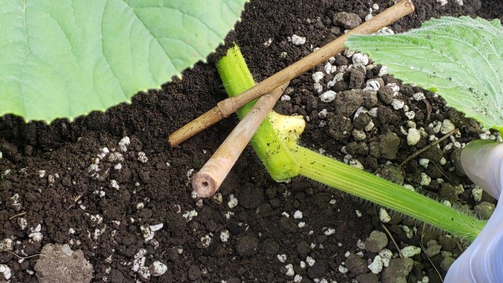 Some thoughts on the terminated end of secondary vines. In my patch after terminating a vine it wants to start shooting upwards. Often 2 nodes would be up in the air and not able to root. I wait for the vine to settle to the ground and hold it down with 2 bamboo stakes. Then simply bury the whole end.