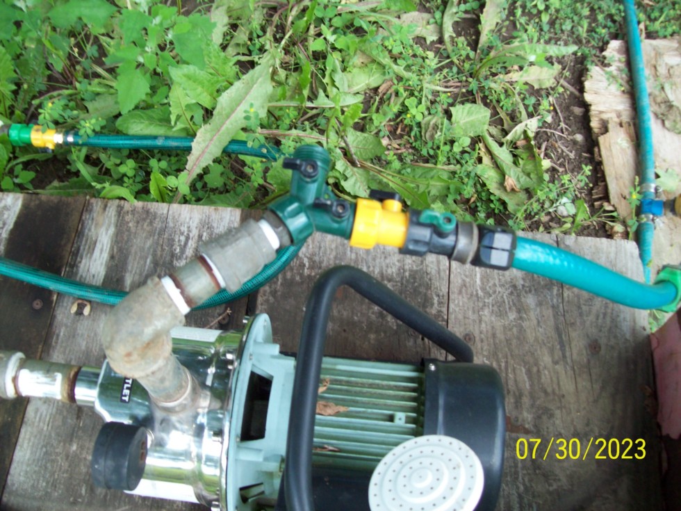 Here is the pump outlet closeup pic. The Y adapter enables me to allow actual water+MG out of the system to prime/purge or to alternatively initiate flow into the main line, which is in total about 1000 feet long; Just for fun, I may measure it this fall before putting it all away. eg