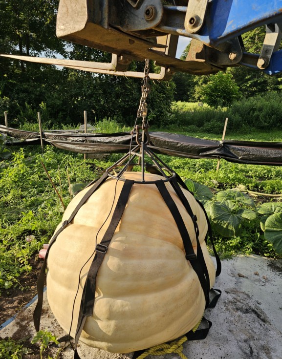 Unfortunately a few weeks ago the 2183 Mendi I was growing, stopped. Very quickly the plant started going downhill. After 2 weeks of sitting in the patch slowly getting soft, we were able to get her weighed. 1037.9 lbs, 1/10th of a lb from my personal best!! I believe if we weighed her earlier, she would have been my biggest fruit ever. Thank you to Art K. for lifting her!