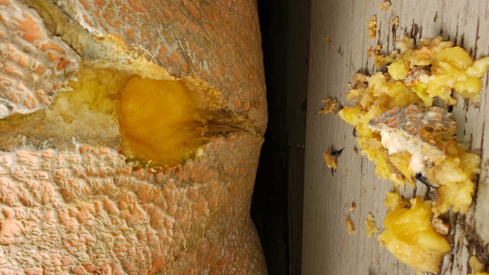 Trouble in paradise !!!! This soft spot developed in a growing crack on the Mendi 2356 3 days ago. The dark spot on the crack looks bad but is very hard. The pumpkin flesh has been scooped down to where its very firm . Hopefully it will dry up and heal over. Have 2 fans on it help the situation. 80% of the lesion is dry but a small spot is not cooperating. This is the one that was intended for Half Moon Bay. October 9th is a long time away !!