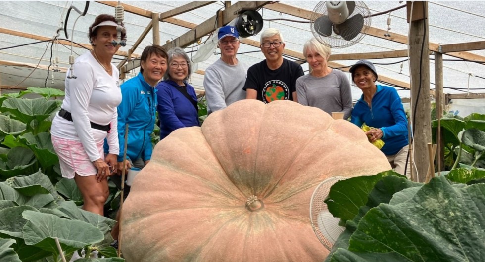 A seniors walking group came by for a patch tour and they are posing with Mama, my biggest pumpkin. Circ 18 feet. It will be going to California along with Baby, my smallest. They will be lifted by a crane truck on Sunday. The excitement is growing not only for the weighoffs but for the 1000 mile drive from Richmond to California. One of my worries was what I was going to do with the pumpkins for the week between weighoffs. Someone suggested that I contact Leonardo Urena. I Facebooked him and he replied in 5 minutes and offed his home to store the trailer and pumpkins. Now that's camaraderie !! Thank you Leonardo !