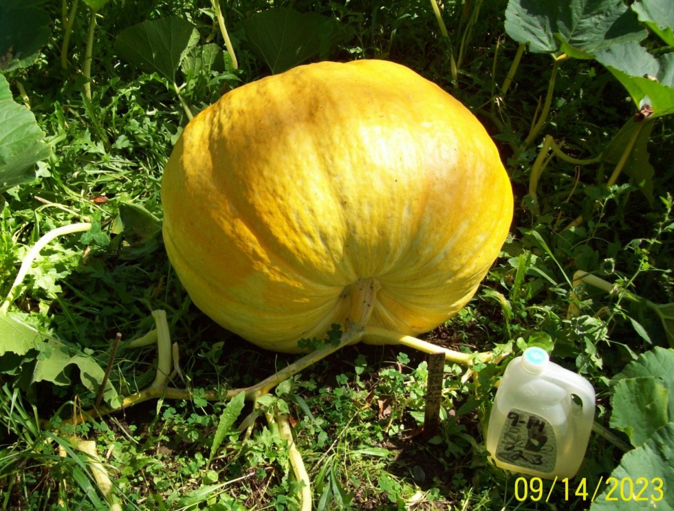 Here is one that is surprising me with its rapid growth in the late season; My (Seed Y X 301.5 Gerry '05); I had not been out back, here in a few days there were suddenly pumpkins' circumferences rising above the leaves - You know that feeling! I was like 'Cool???'; It has a great texture to it as well - excellent for adjusting it to the vine! Ahhh, Seed Y. Yeah, cool...Est. Wt. 10 days ago was 205.5 pounds. Time to measure it again! eg