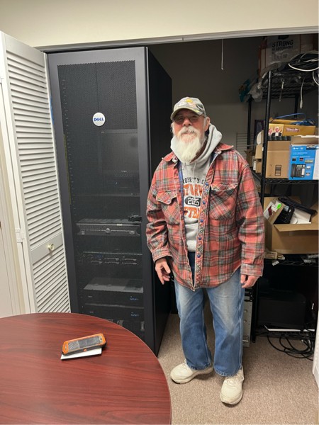 Mr. Orange, Norm Gansert posing with the BigPumpkins.com server rack!
