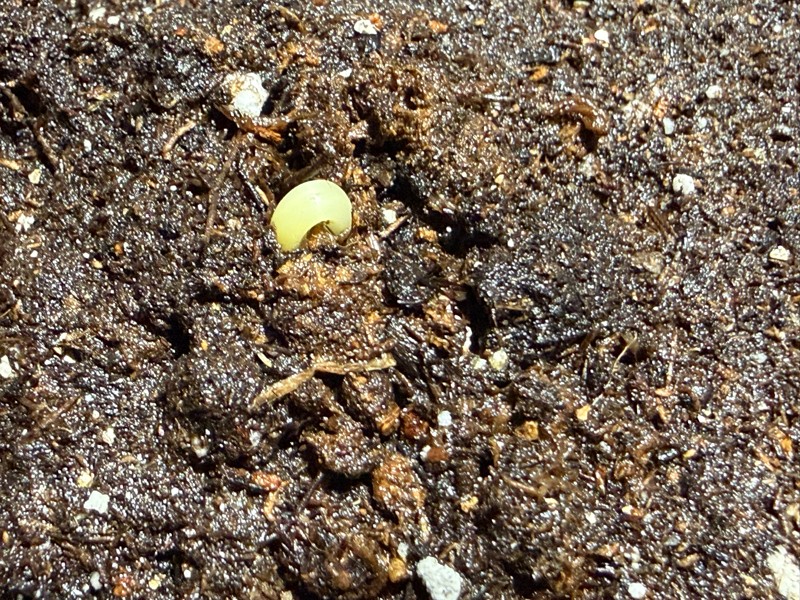 These seeds I didn't need to peak at. 198.5 Crews (202.5 Crews x self) However the chosen one is coming up with the seed. I piled some dirt around it and stuck it under the light.
