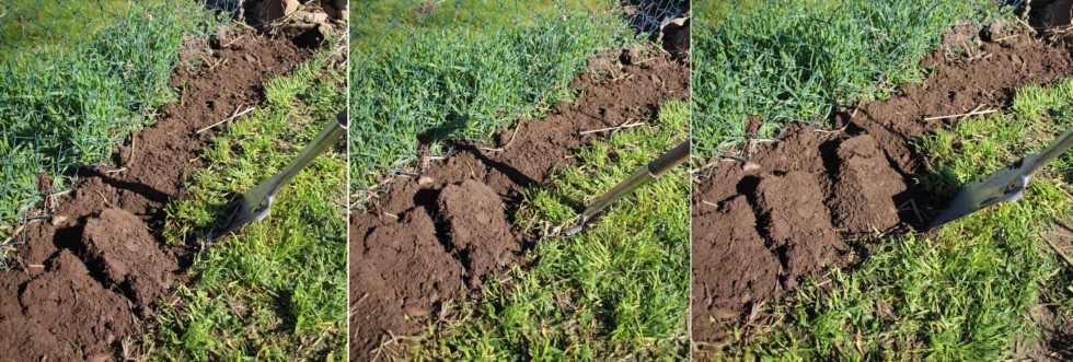 Step 3: For all of the next rows I turn shingles of soil. That means, I insert the spade into the soil at an angle of about 45 deg (shown in the first and second pic of this trio), and the front third of the spade reaches under the already turned row of soil (use your imagination...in the 2nd pic you can 'see' that the spade must reach under the already turned soil). The 3rd pic shows what it looks like when that particular shingle has been turned.