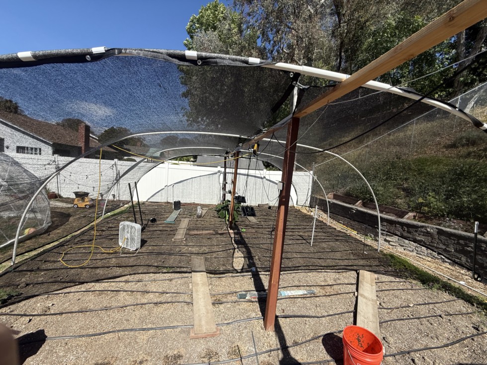 After I was done, I stood back and a thought occurred to me.. My structure was unintentionally modular, and accepted my cloth with almost no adjustments needed. It is short one "rib" section from covering the whole patch, or about 7 feet. But that can be fixed another day.