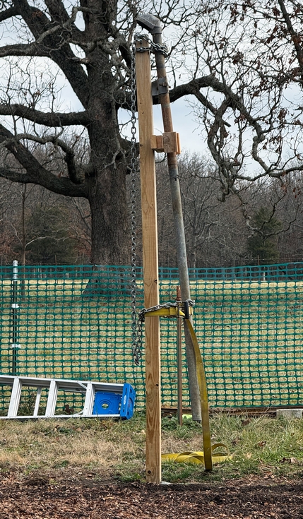 One of the 4x4 post to hold up shade cloth had bent significantly as often happens with treated lumber. I came up with a simple solution for this common problem. 1. Attach some short 2x4 scraps to the post at the apex of the bend to act as a fulcrum. 2. Find the old weather head pipe you have been saving for some reason. 3. Chain the weather head to the top of the bent post 4. Wrap a 10,000 lb ratchet strap around the bottom of the pipe/post, and tighten as much as possible without bending the pipe. 5. Tighten the ratchet strap a few clicks each week until the post is in the desired orientation, the leave it in this position several more weeks. 6. Attach another 2x4 along the side of the straightened post before removing the pipe, otherwise the post will eventually return to its original bent position, as I learned from experience.