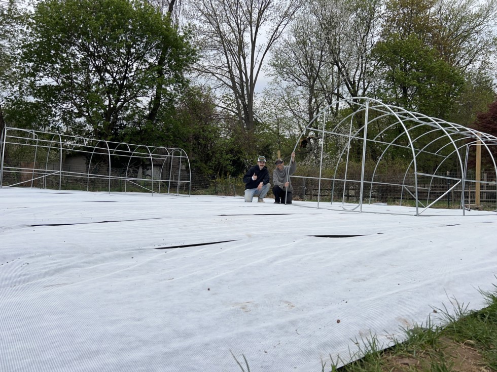 Today I put down my white fabric and then Matt came to help me put together my new greenhouse frames. The patch is really coming together. I should be ready for transplanting next weekend. Too bad the weather is looking awful for the foreseeable future.