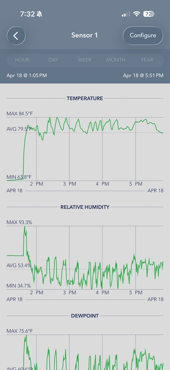 Temperature data from the mini greenhouse. Sensor placed in there this afternoon shows the ventilation system keeping temps between 80-85, with fan set to turn on at 85.