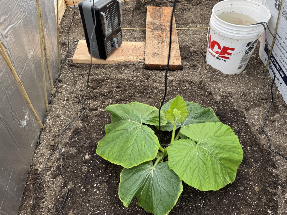 24 hours post-transplant, 19 days after planting the seed, and the 2741 Haist is looking incredibly happy in the dirt. The vine tip is already stretching, and the leaves have fully perked back up from the move.