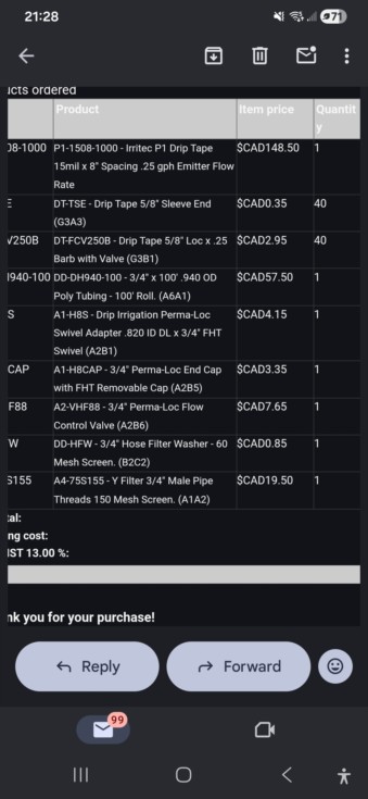 A little expensive, but im setting up drip lines in the greenhouse. Hopefully its another step towards removing any potentially damaging variables from the season. 3/4 main line, 5/8th drip 8 inch emitter spacing, 16 inch line spacing, hopefully it'll be an easy turn it on for 10-15 minutes twice a day to maintain soil moisture.